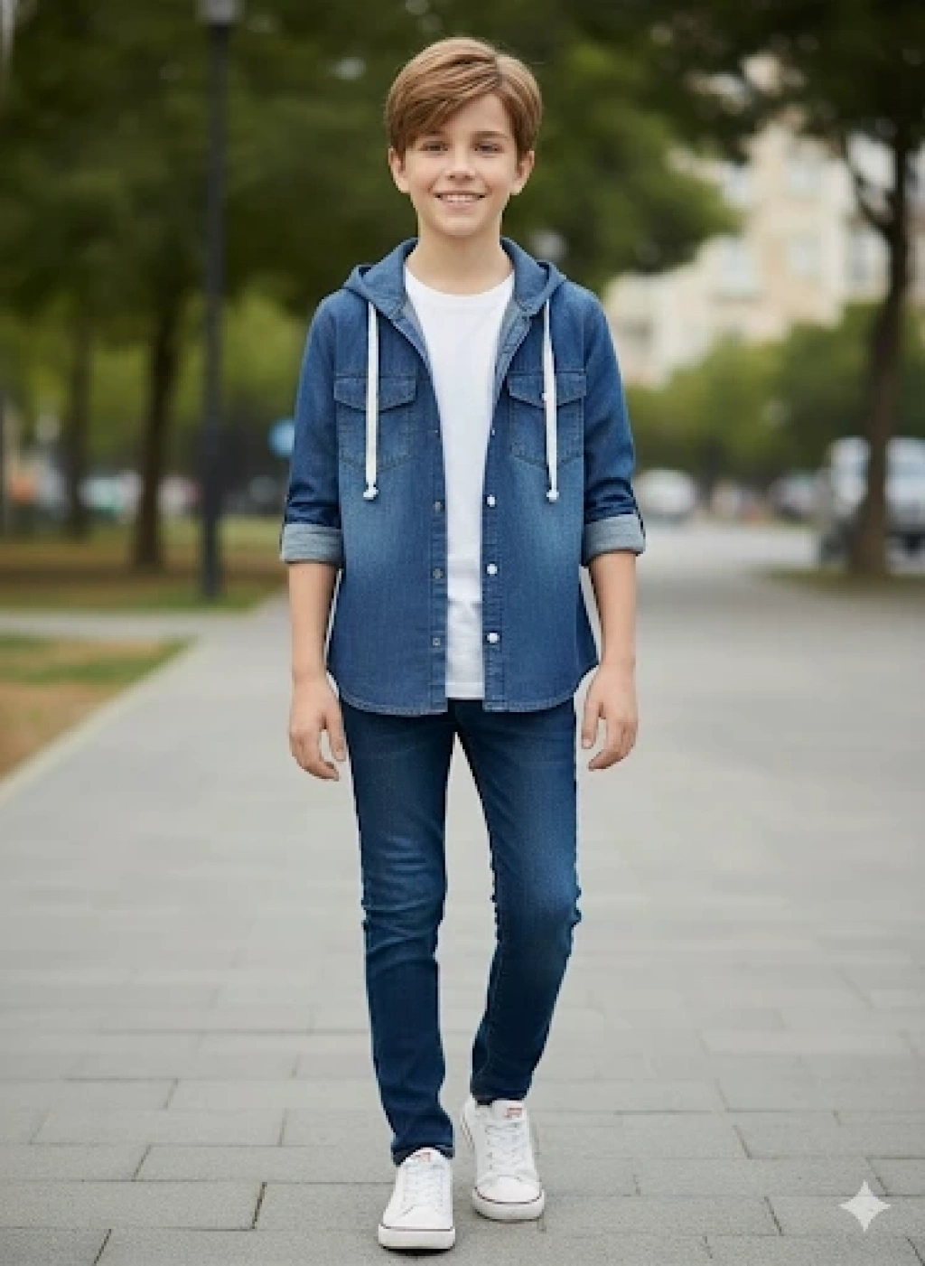 Şık ve rahat bir görünüm sunan Kapşonlu Kot Ceket Mavi, 5-7 yaş arası erkek çocuklar için ideal bir seçenektir.