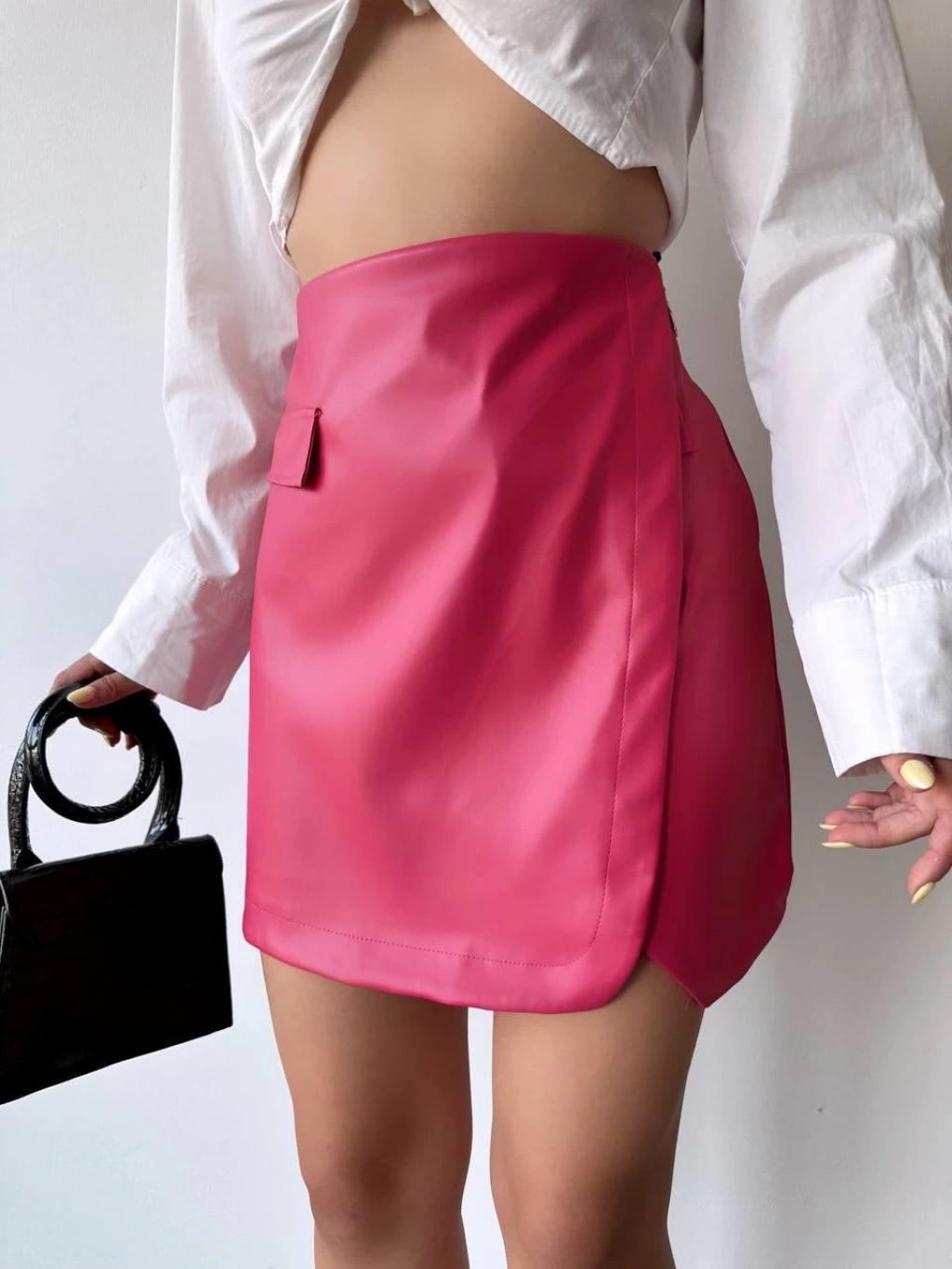 Şıklığı ve zarafeti bir arada sunan Cep detaylı oval kapaklı deri etek fuşya h240048, gardırobunuzun vazgeçilmez parçası olmaya aday.