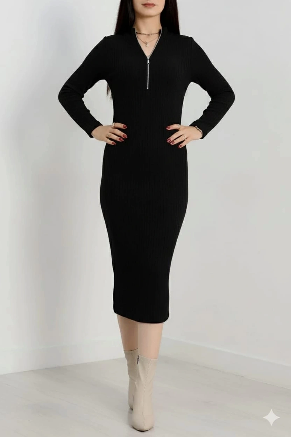 Bu şık elbise, vücudu saran fitilli kesimiyle modern bir görünüm sunarken, fermuar detayıyla da fark yaratıyor.