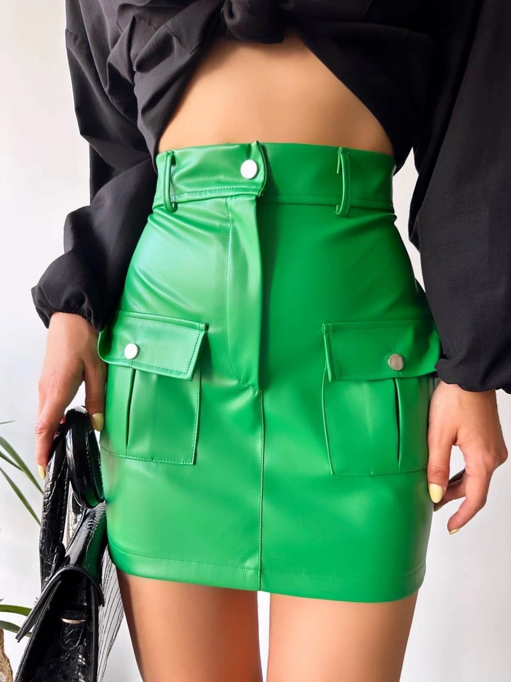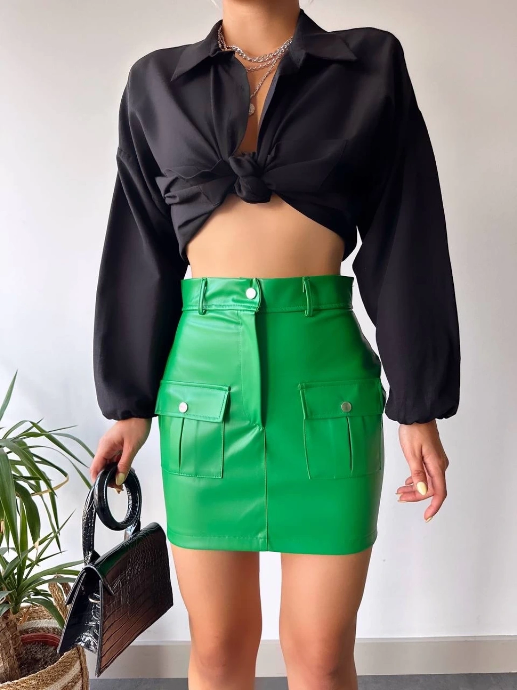 Önden iki cepli deri etek, gardırobunuzun vazgeçilmezi olmaya aday!